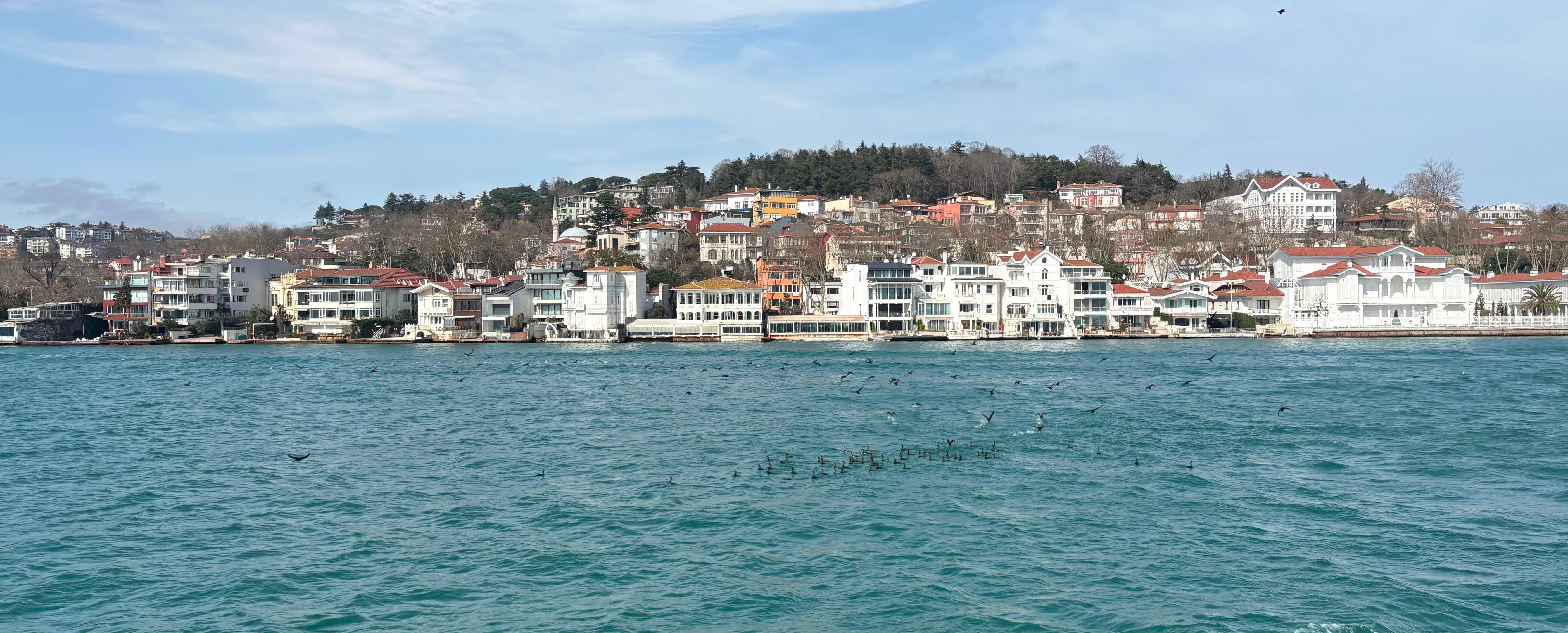 Before leaving Istanbul, though, I had a couple of days sightseeing with a friend. The weather was… seasonable: bright sunshine and blue sky one day and grey rain and a cold February wind the next. One was perfect for seeing the city from the water. We took a ferry down the Bosporus and watched sea birds glide over the waves. From the sea you can see the distinctive neighbourhoods of the city, all rising on hills or, perhaps more accurately, all crowding down to the waterfront, where houses, hotels and embassies were often built to be most visible and most decorative from the water.