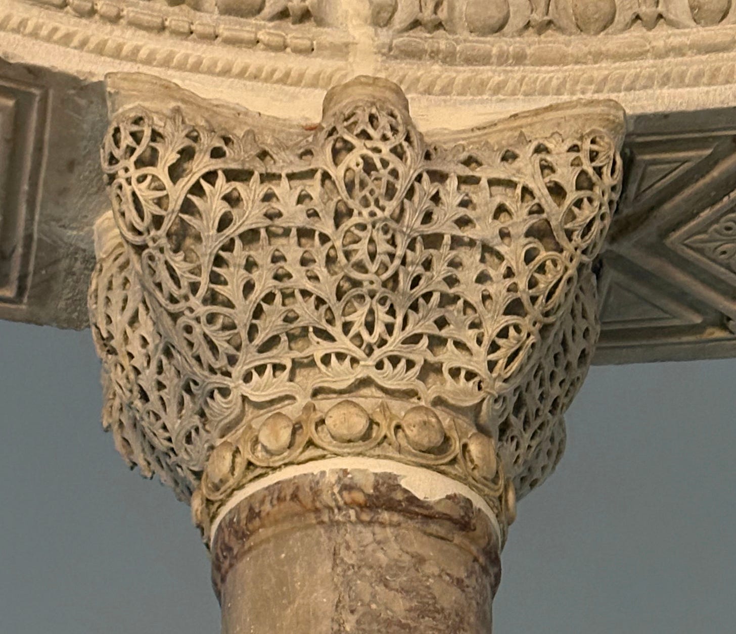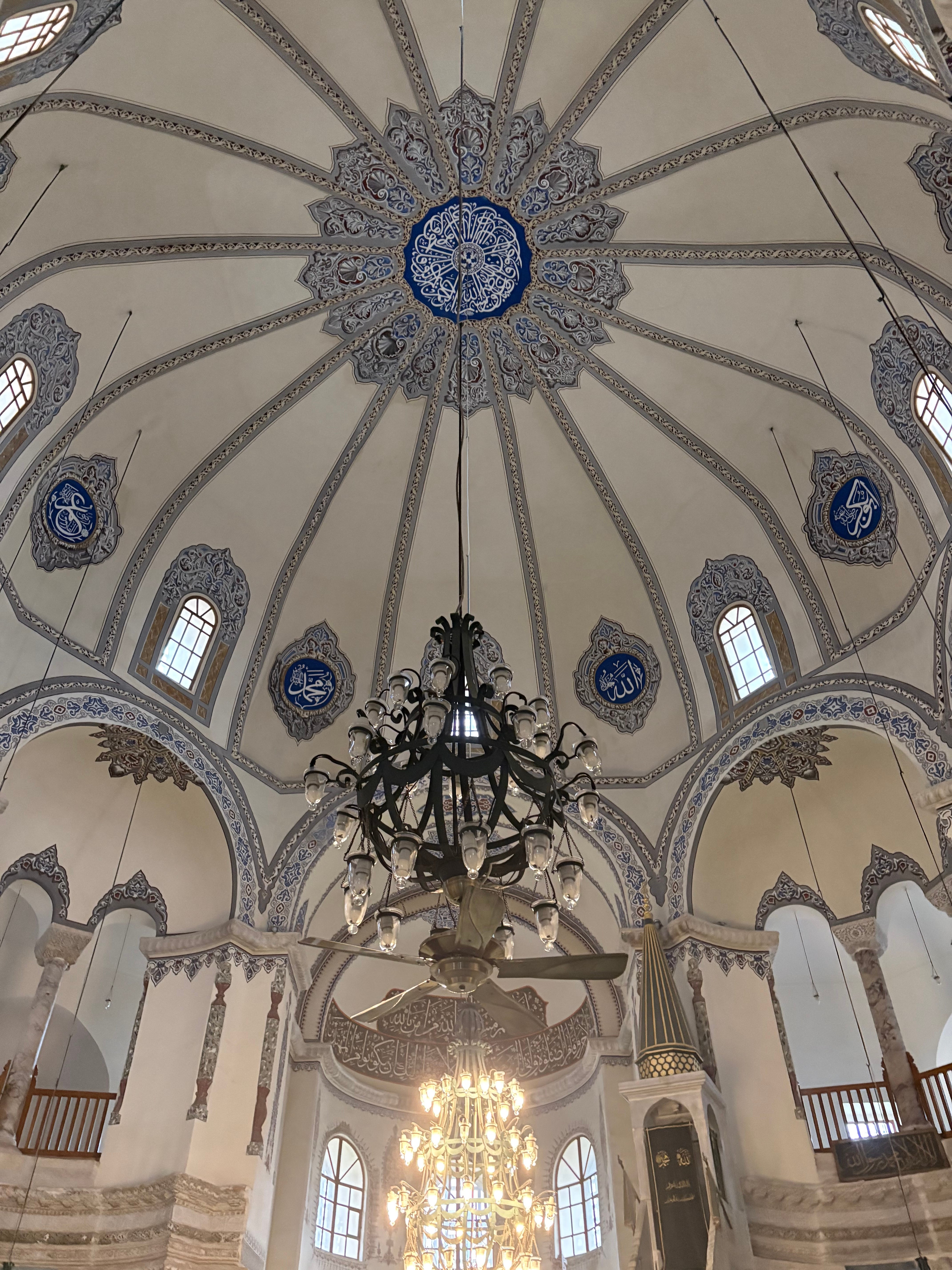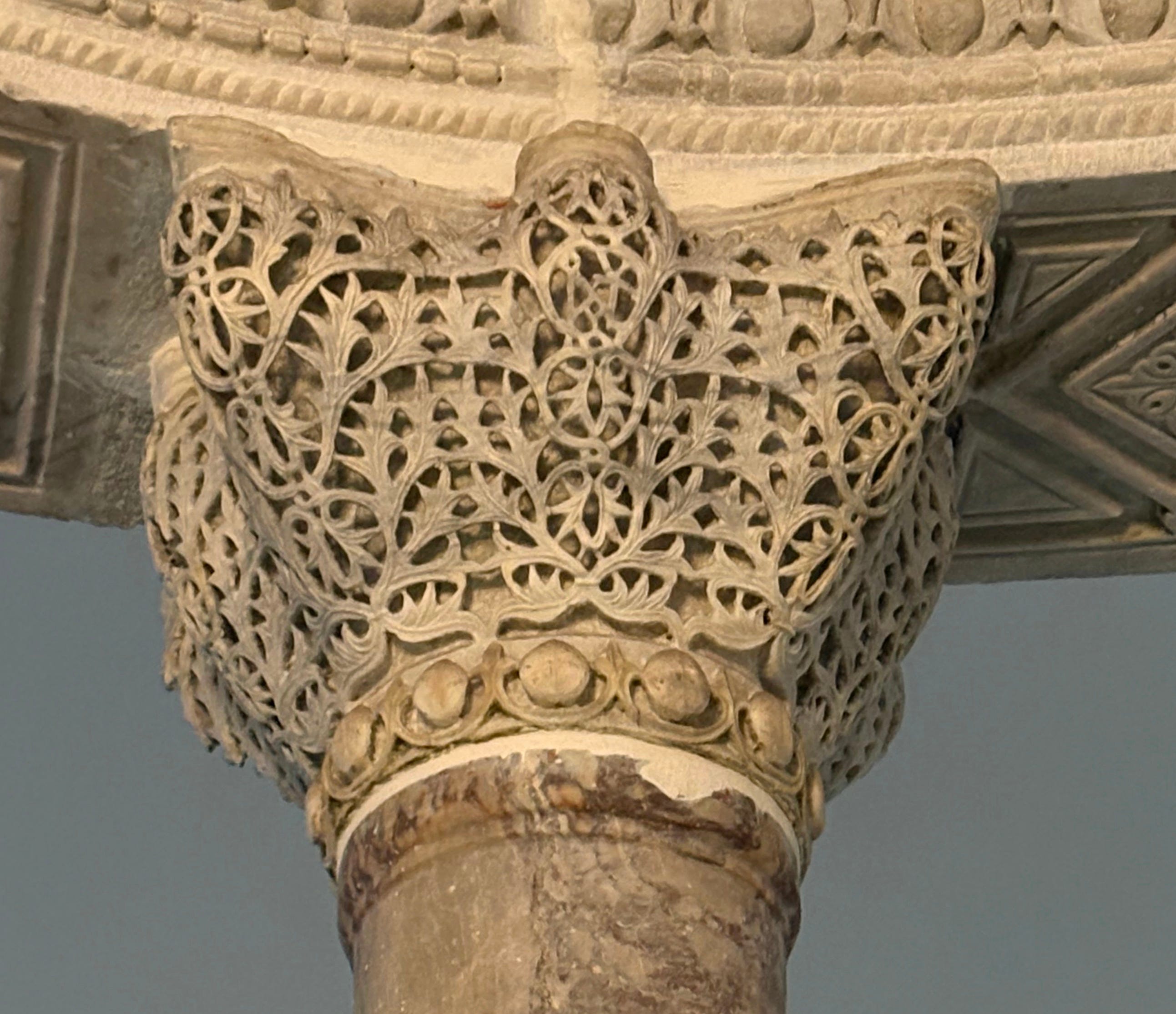 The walls are mostly painted white with floral decoration, which is all quite new. Written records say that when it was a church it would have been covered inside in different-coloured sheets of marble and mosaics. Those are gone but stone columns and their carved tops remain from the sixth century. The column tops are carved in a style known as ‘basket’ carving, because of how the artisans worked in from the outside to create a raised net of stone, with foliage patterns. These also include monograms, or complex clusters of letters, often intertwined, that could be used to spell out a name. In these cases they spell out the names of Justinian and his wife, Theodora. Around the inside rim of the domed roof is also a poetic inscription that mentions Saint Sergios (though not Bakkhos, quite unusually) and which talks about the glory of the Roman army.