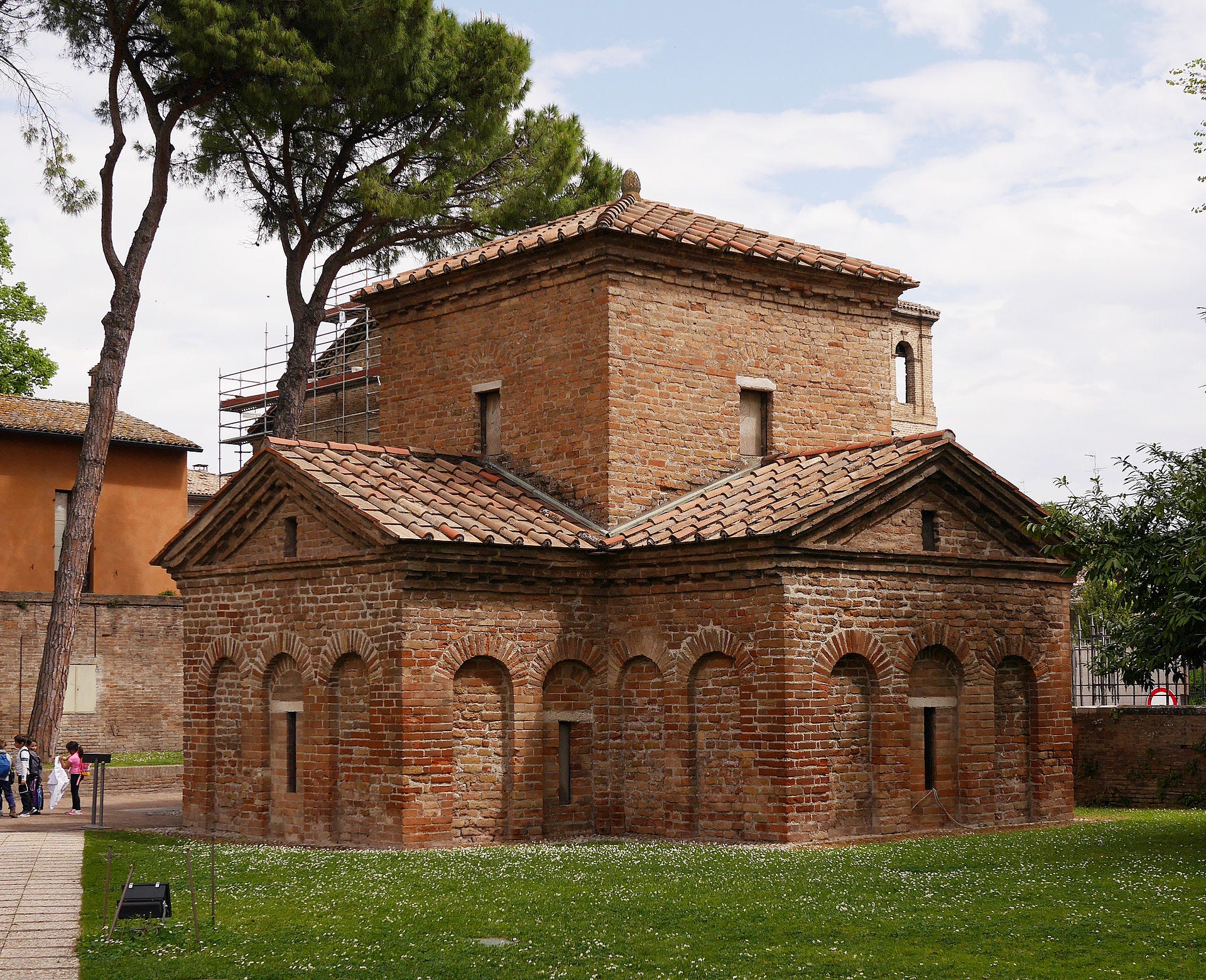 As much as St Polyeuktos was a lavish church that perhaps laid down a marker that Justinian I felt he needed to beat, it wasn’t architecturally that similar. The so-called ‘Mausoleum of Galla Placidia’ was built in the 5th century in Ravenna, in Italy. It was a Roman capital city, at that time - a regional subordinate to Constantinople. The mausoleum is pretty tiny, but four vaulted chapels support a central dome and the whole interior is lined with mosaics and marble. The shapes are still square, not rounded on the outside but its overall shape is quite like a miniature of the Hagia Sophia.