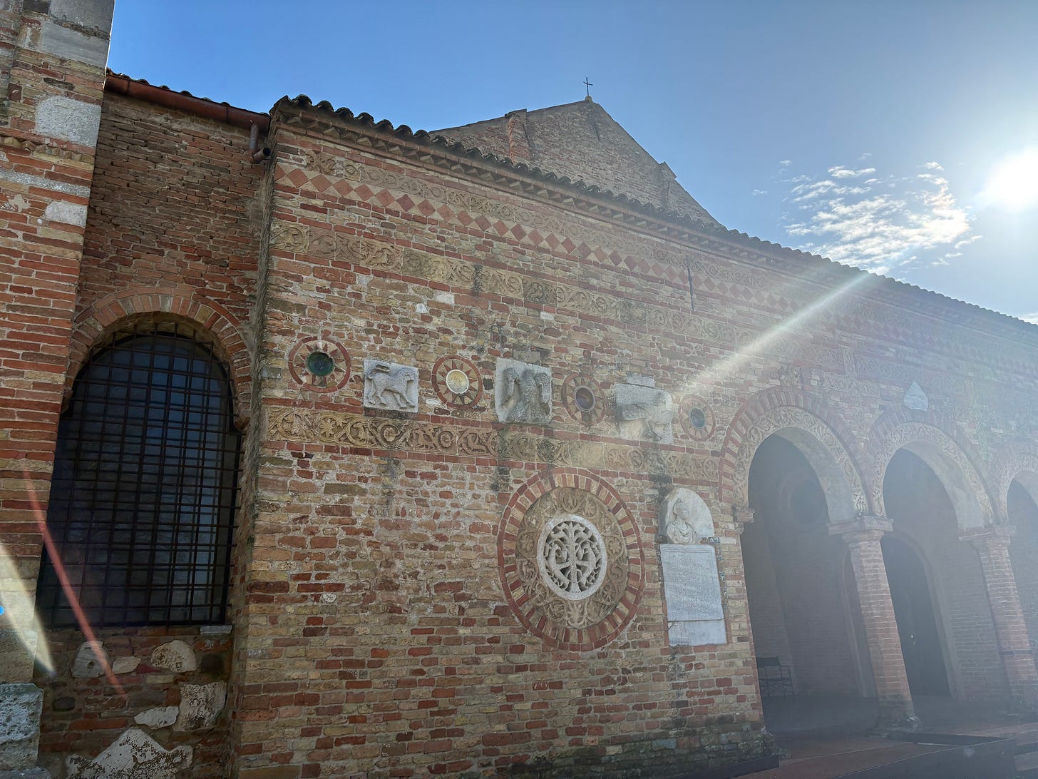 Its walls are set with older pieces of sculpture, reused from Roman buildings. From the eleventh century it also became common to set glazed ceramic bowls into the facade of buildings. There advertised connections to wider trade networks, especially with the Muslim states of the south of the Mediterranean. But they were also colourful and would have glittered in the light. You can see in the picture below where they would have been, between each of the arches (which have reused columns in them!).