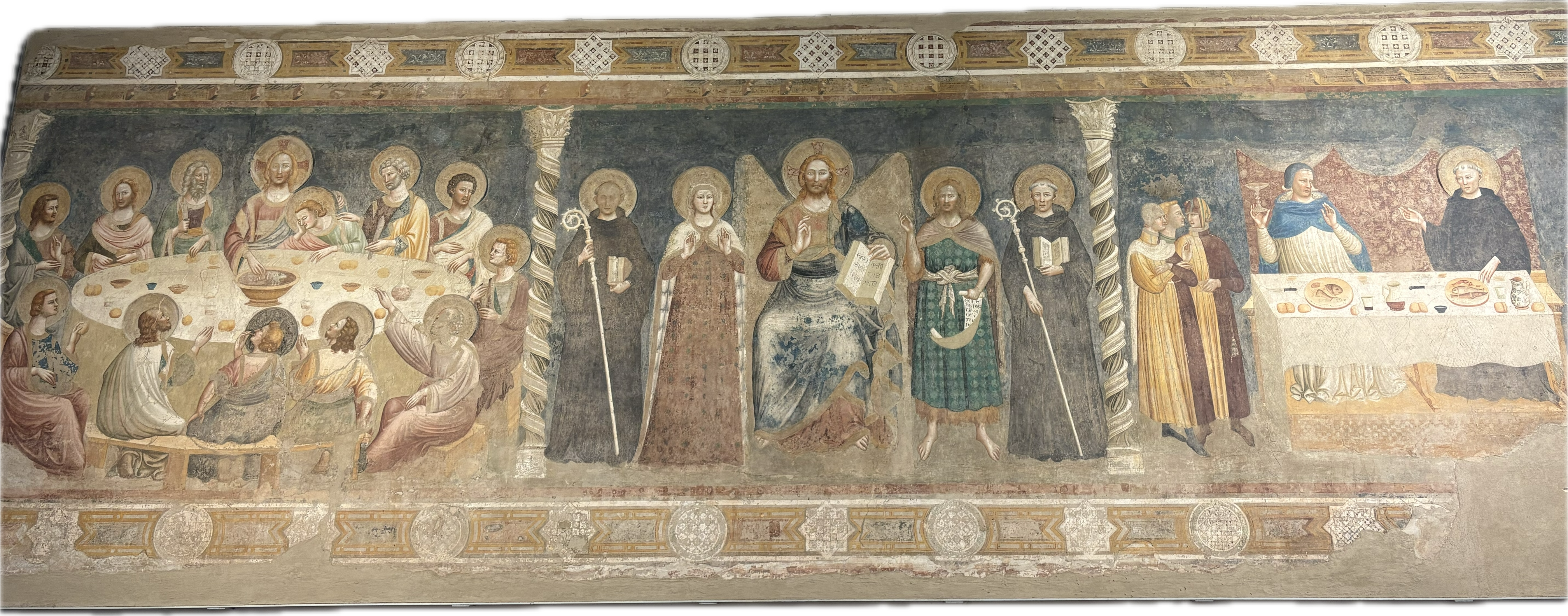 This huge wall painting covers the entire back wall of what would have been the refectory or dining room, hence the image of the Last Supper to the left. It had been painstakingly peeled away from the wall by conservators and then re-hung on a metal frame to stop damp damaging it, which is itself quite something to contemplate. This is a painting from the mid-14th century when artists were experimenting in Italy with ideas like perspective. Check out the table on the right, which is nearly but not quite at all the right angles. And the wine in the glasses is going its own way, too. But these were experiments with new techniques and an effort to think differently about space.