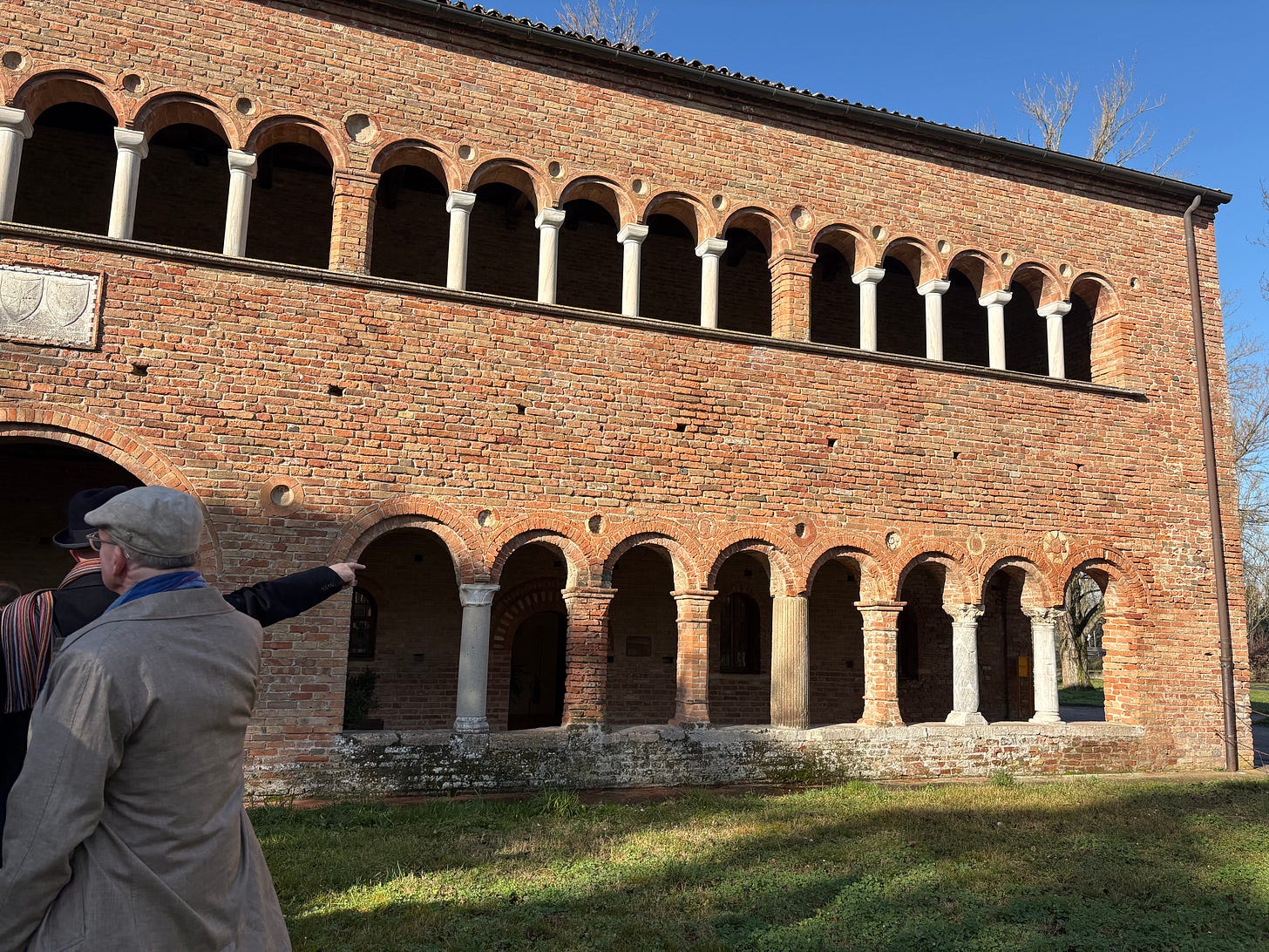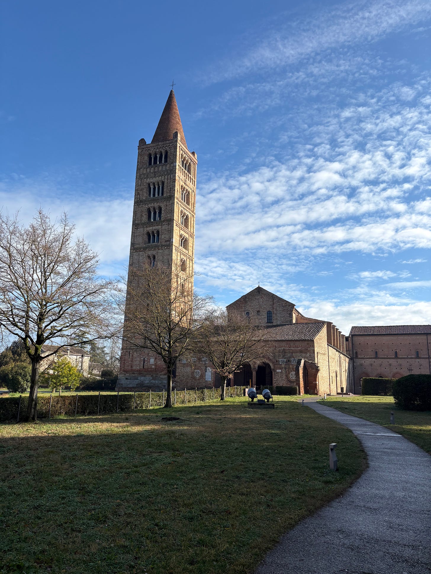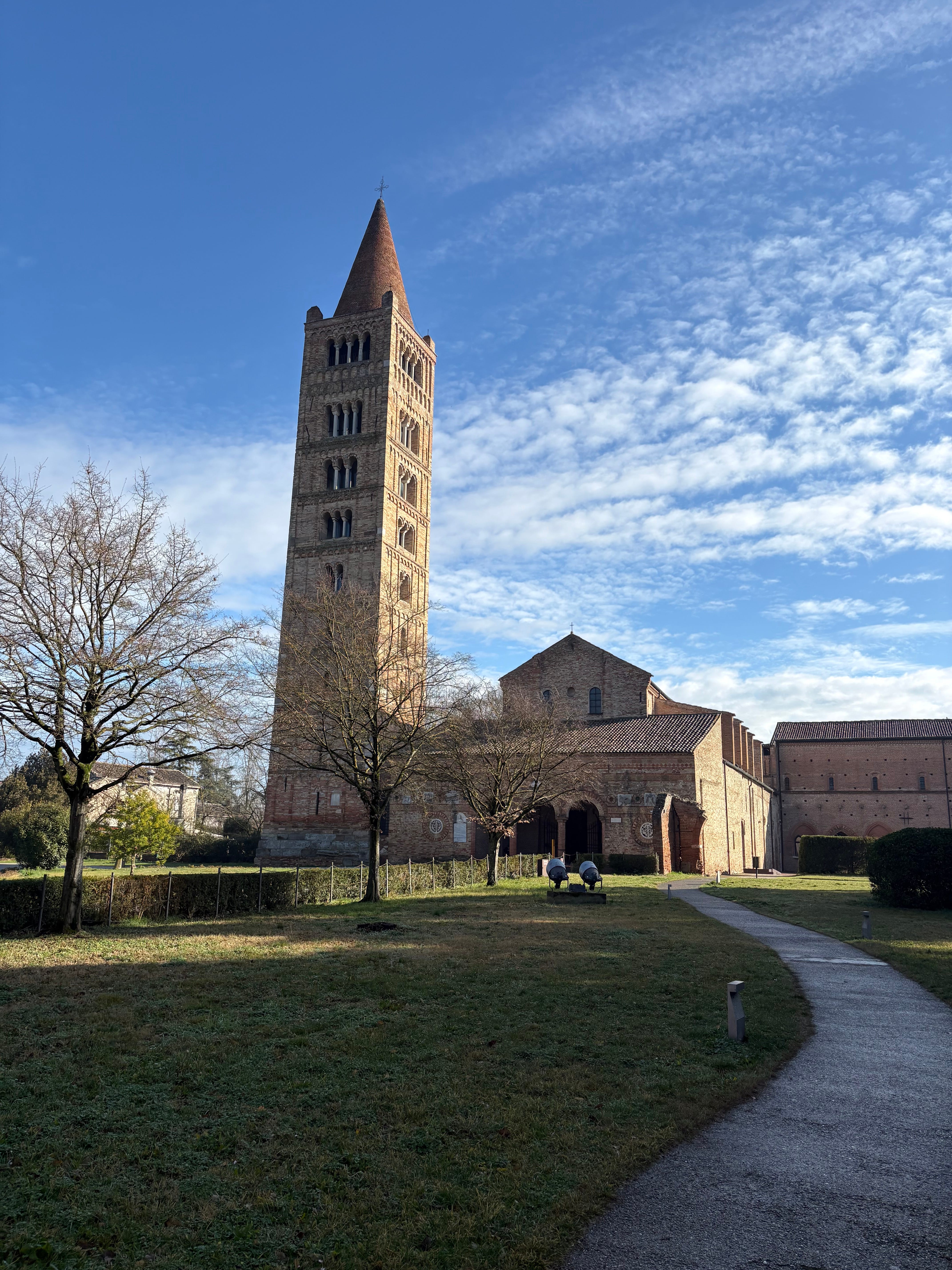 This is the abbey of Pomposa, between Venice and Ravenna, in northeastern Italy. It was built in the 6th century as a Benedictine monastic centre, though most of the standing buildings today date from the 11th century and just after. The land around it is fly for miles around, so that this would have stood out in the landscape. Abbeys like this, in the second half of the fist millennium CE across Italy became centres not just of religion but of local government as the Roman Empire shrank and lost a lot of its state capacity. Over the centuries, Pomposa became a major centre for justice, administration and music.